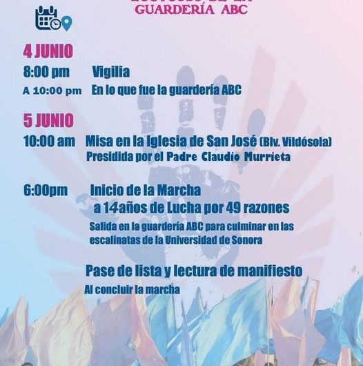 Domingo 4 de junio, vigilia en lo que fue la Guardería ABC, de 8:00 pm a 10:00...