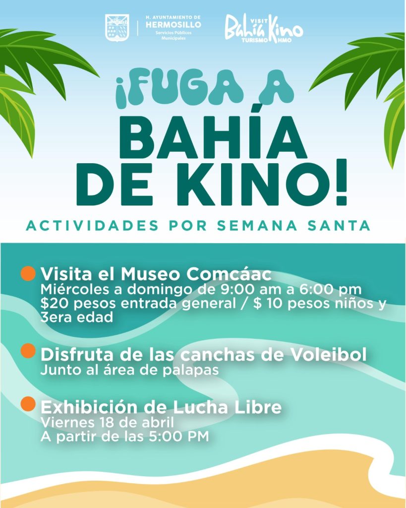 Fernanda Cisneros, directora de Desarrollo Turístico de la Agencia Municipal de Desarrollo Económico, precisó que en Bahía de Kino del jueves 17 al sábado 19 de abril, de 10:00 de la mañana a 6:00 de la tarde, brindará traslados gratuitos dentro de la localidad, gracias al apoyo de DIF Hermosillo.