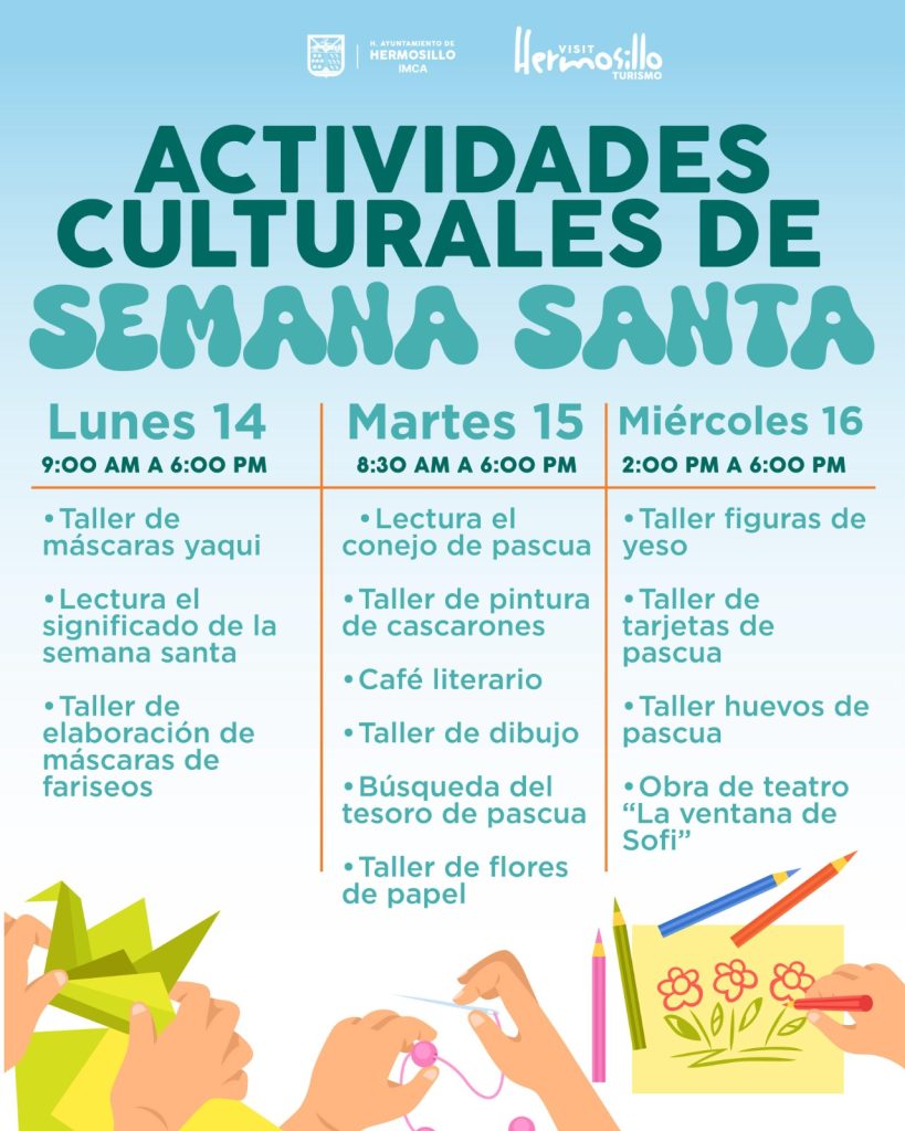 En Hermosillo del lunes 14 al miércoles 16 de abril, el Instituto Municipal de Cultura y Arte (IMCA) realizan talleres de elaboración de máscaras, dibujo, manualidades y lectura creativa en diferentes espacios, cerrando este miércoles 16 con la puesta en escena “La Ventana de Sofi” en la Concha Acústica del Parque Madero, a las 6:00 pm.