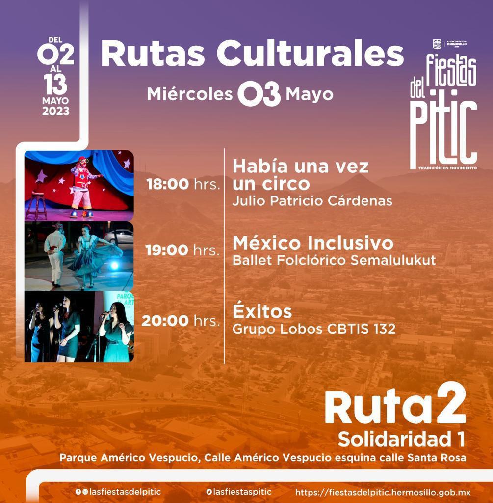 Las Rutas Culturales tienen como objetivo llevar presentaciones artísticas y culturales a las colonias y zona rural de Hermosillo para que las familias puedan vivir la experiencia de las Fiestas del Pitic en sus comunidades.