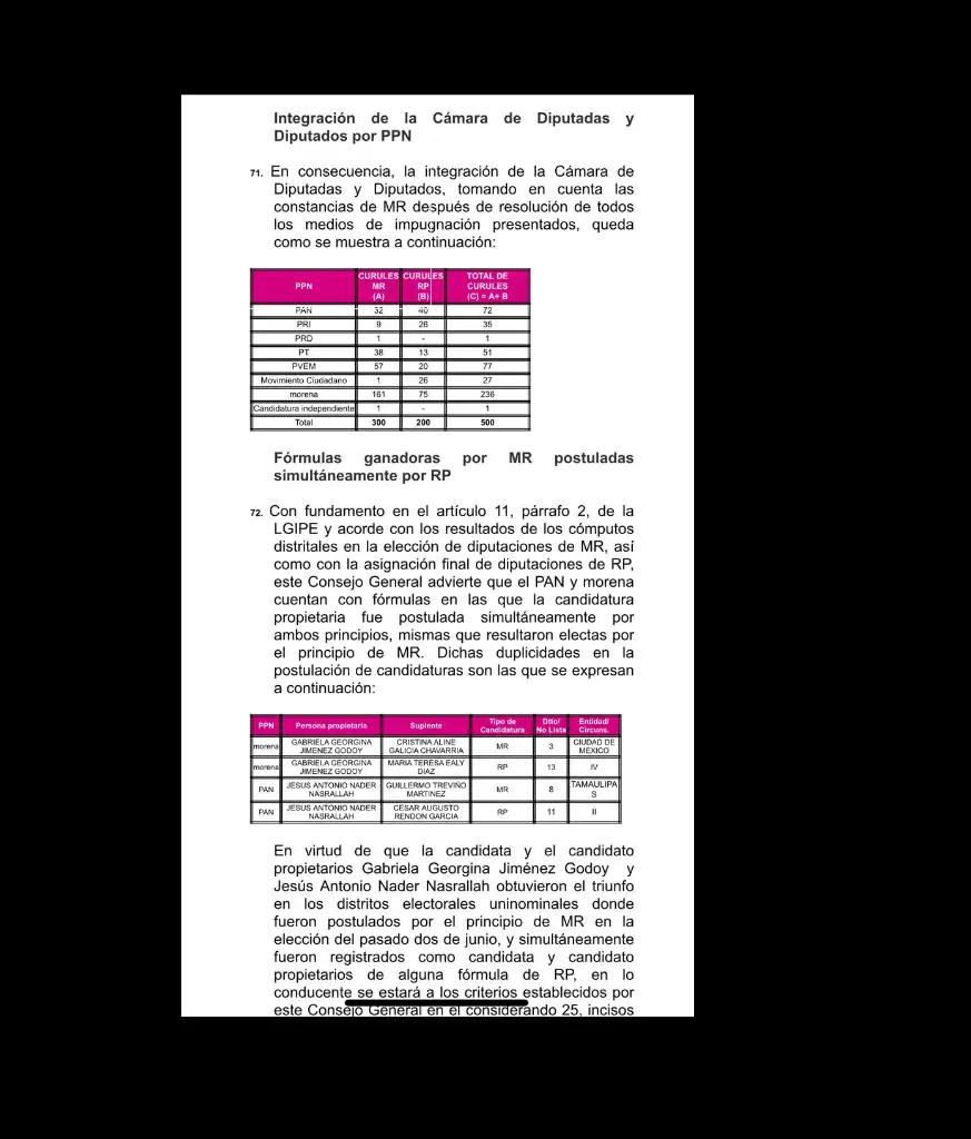 En tanto, en el Senado, el anteproyecto da 60 escaños a Morena, incuidos aquí los de mayoría relativa y representación proporcional; 22 al PAN; 16 para el PRI, 14 para el PVEM, nueve para el PT, cinco para Movimiento Ciudadano y dos para el PRD.