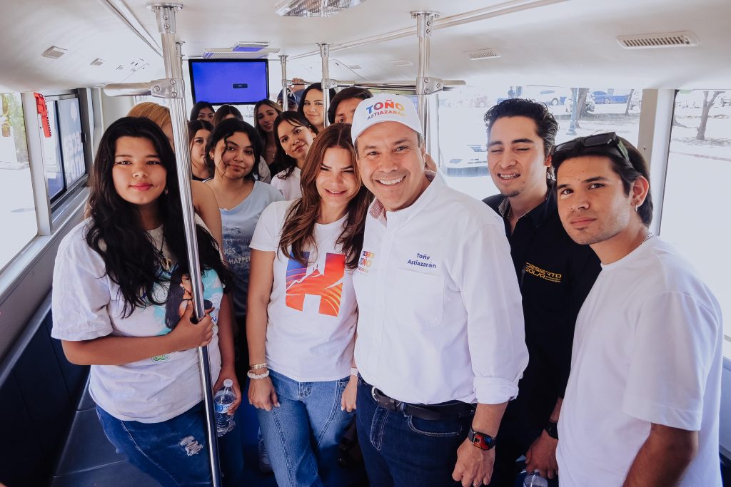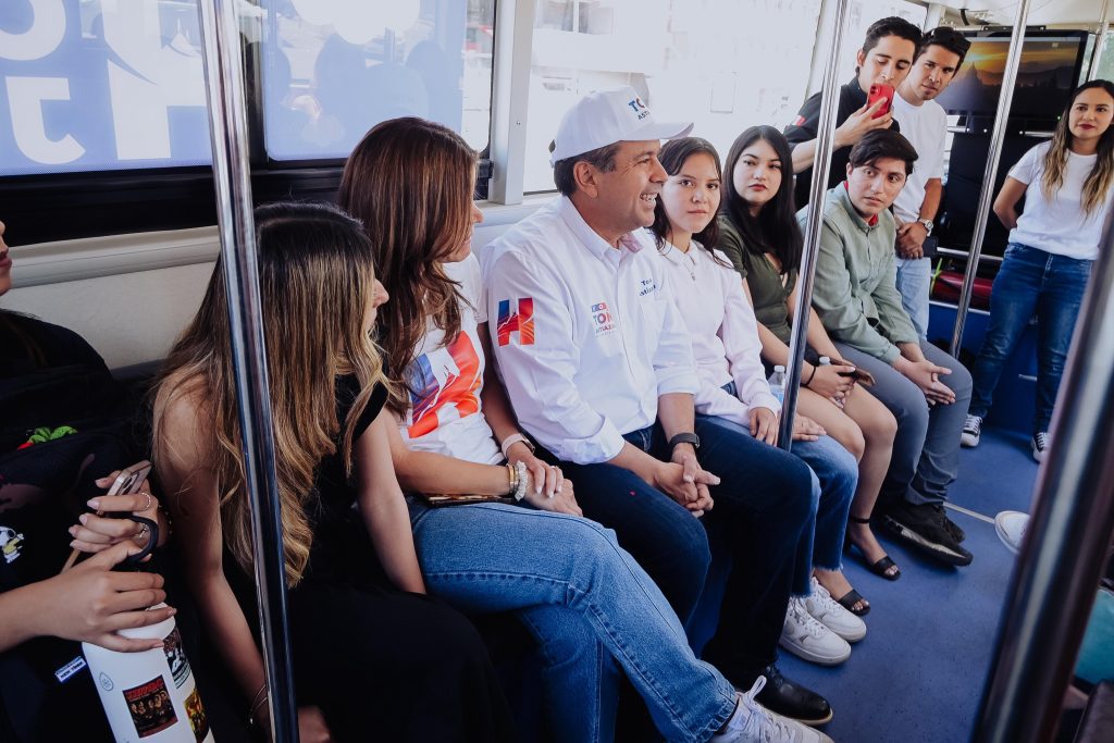 El candidato a la presidencia municipal por un segundo periodo arribó al Parque Madero junto a su esposa Patricia Ruibal y estudiantes de diversas instituciones académicas, quienes estrenaron esta unidad con capacidad de hasta 30 personas en un recorrido por las calles de la capital de Sonora.